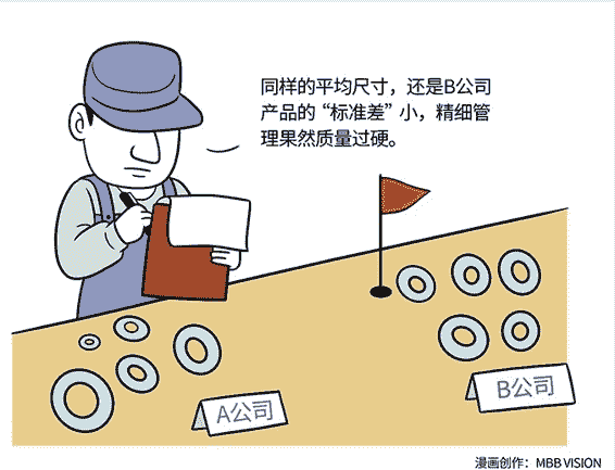 在商业上,标准差越小,产品质量的“稳定性”越高。这个“稳定性”,特别重要。比如上述两家公司的产品,平均直径一样,但B对质量的控制更加稳定,我会把订单交给B。比如两个投资经理,你看他们今年的总投资收益都是15%,但是A大起大落,B非常稳定,我会把钱投给B。这个稳定性,几乎就代表质量管理水平和过程管控能力。