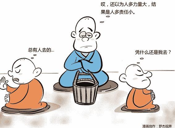 中国有句谚语:一个和尚挑水喝,两个和尚抬水喝,三个和尚没水喝。从社会心理学的角度看,这背后的原因就是“旁观者效应”,也叫“责任分散效应”,就是多人共同负责,等于没人负责,责任除以二等于零。在管理中,如何避免旁观者效应带来的危害呢?记住两个心法:第一,责不可共;第二,责不越级。