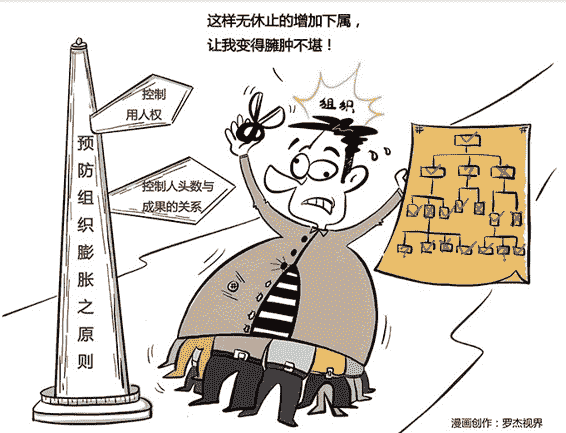 为什么?第一条路显然不能走,一辞职,立刻陷入经济危机;第二条路也不能走,那个人很可能成为你未来的竞争对手。只有第三条路。你找人分担了你的工作,儿子的国际学校也保住了。然后,你的两个平庸的下属,再为自己找到更多的下属,下属的下属再找下属。如此往复,最终产生臃肿的管理层。这是著名的“帕金森定律”。1958年,英国历史学家、政治学家西里尔·帕金森出版了《帕金森定律》一书。他说,组织一旦形成,就会受到“增加下属法则”和“增加工作法则”的影响,开始自我膨胀。法则:增加下属法则我先来解释一下“增加下属法则”。回到最开始的问题。为什么大部分人会选择第三条,也就是“增加下属”?那是因为:权力的危机感。如果你是一个私营业主,公司100%是你的。早期发展不错,但做大了后,管理一团糟。你面试了一位经验丰富的经理人给你做CEO。聊完后,你大喜,甚至觉得自愧不如。这时候,你会因为权力的危机感,而不把他收入麾下吗?不会。因为,公司永远是你的,他再优秀,也不会影响你绝对的权力。我们常说,刘邦会用人,用张良,用韩信;刘备会用人,用张飞,用孔明。好像咱们老刘家都挺懂管理的。但你要记住,刘邦和刘备,都拥有绝对的权力,公司100%是他们的。但你把这位CEO招进来后,他会再招一个比他更强的人做副总裁吗?这就难说了。因为,他的权力是你给予的,也是可以被你收回的。他就有权力的危机感,所以他只想增加助手,而不是对手。法则:增加工作法则帕金森说,一个人可以在10分钟内看完一份报纸,也可以看半天;一个忙人20分钟可以寄出一叠明信片,但一个无所事事的老太太为了给远方的外甥女寄张明信片,可以足足花一整天。这主要是看,你有多少时间。有多少时间,你就会忙多久,而且还觉得自己忙得很有价值。1914年到1928年,由于《华盛顿海军协定》的限制,英国海军士兵减少了三分之一,军舰减少了三分之二,但军官从2000人增加到3569人。1935年到1954年,英国海军地位不断下降、殖民地不断减少,但海军部从8118人,增加到33788人;殖民部从372人增加到1661人。增加下属后,大家乐此不疲地给彼此增加工作,企业因此患上“大企业病”。大企业病就是,在行政管理中,行政机构会像金字塔一样不断增多,行政人员会不断膨胀,每个人都很忙,但组织效率越来越低下。这条定律又被称为“金字塔上升”现象。