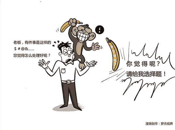 一件事,本来是下属的责任,但是因为每个人都有“逃避责任”的天性,他们遇到困难时,在家依赖父母,在公司依赖老板。“你觉得怎么处理好呢”这样的问题,其实就是把他的责任,那只猴子,抱过来找你说:老板,你帮我照看这只猴子好吗?