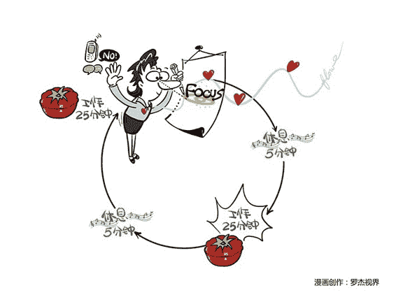 第一、防火防盗防打断。一次打断,会带来两次大脑中的任务切换,一来一回,可能会浪费好几分钟。番茄工作法的关键,是像防火防盗一样防打断,让这25分钟非常专注。怎么做?最被动的打断,来自电话。把手机关机,或者设为勿扰模式,只允许老板、家人的电话响铃,其余自动短信回复:“现在正忙,稍后给您回电。谢谢。”老板的电话接起来,如果不是急事,可以礼貌地说:“老板,我知道了,我30分钟后回复您可以吗?”最诱人的打断,来自微信。关闭微信和所有APP的提醒功能。那些动不动叮一下,震一下,亮一下屏,提醒我它的存在的APP,还不能关闭的,一定是流氓软件,我会一律卸载掉。微信做得很好,它甚至专门有个功能,叫:免打扰1小时。最难防的打断,来自自己。突然一件事出现在你脑海中,比如,想起忘了订火车票了,或者一个灵感冒出来了。你可以在手边放一张纸,或者电脑上打开一个记事本,用10个字记下这件事后,清除出大脑,然后继续专注刚才的番茄。必须坚决拒绝打断,否则别拿出番茄钟。