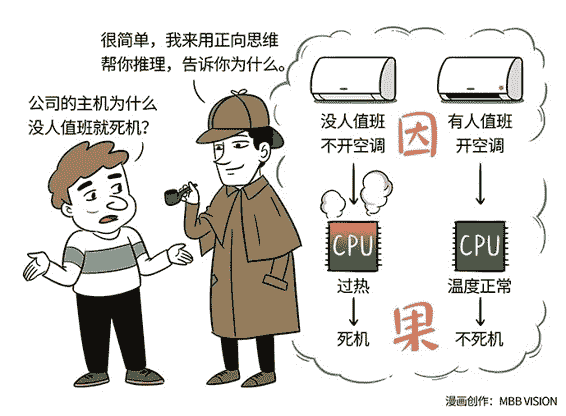 而在这个案例中,有四个首尾呼应的因果逻辑:1)人不在,关空调;2)关空调,温度高;3)温度高,CPU过热;4)CPU过热,就宕机。这四个中间,只要有一个因果逻辑缺失了,比如你从来没有意识到,这世界上居然会有人为了省电,人不在就关掉机房的空调,缺了这一环正向思维,那你这辈子也解决不了这个问题。