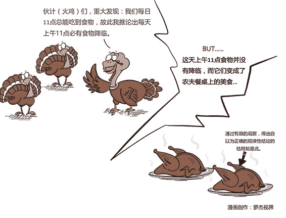 农场里有群火鸡,农场主每天中午十一点来喂食。火鸡中有位科学家观察了近一年无例外后宣布发现了宇宙一个伟大定律:“每天上午十一点,会有食物降临。”感恩节早晨,它向火鸡们公布了这个定律,但这天上午十一点食物没有降临,农场主将它们捉去杀掉,把它们变成了食物。