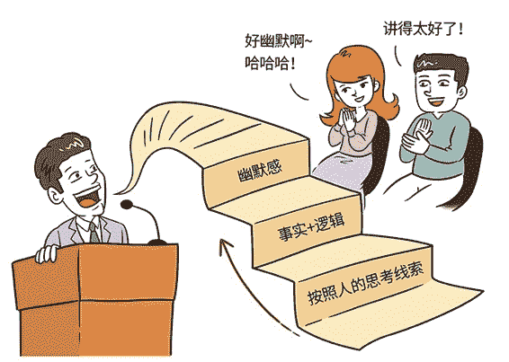 铺设基于“听讲逻辑”的“认知台阶”,有三个关键点:第一,按照人的思考线索,而不是知识的树状结构来演讲;第二,无法否认的事实+无可辩驳的逻辑;第三,用幽默感,让认知的路上满是风景。