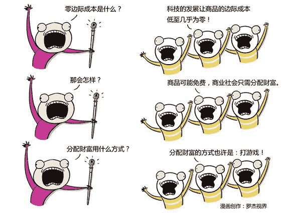 这可能导致所有商品都将免费,商业社会的基本功能,从创造财富和分配财富,变为只需要分配财富。而分配财富的方式也许会是:打游戏。