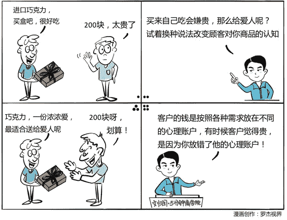 你要改变顾客对你商品的认知,让他从不愿意花钱的心理账户,转移到愿意为此付钱的那个心理账户里面去,这个时候,你就会发现,可能曾经很小气的客户变得非常大方起来。你的客户其实并不真的是小气,而是你的这个商品,并不在他愿意为此付费的那个心理账户里面。