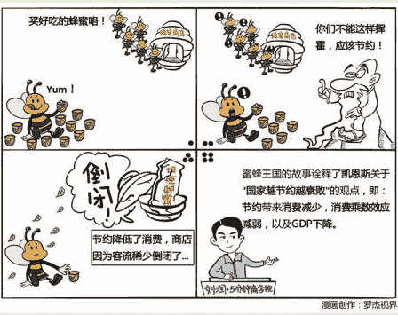 著名经济学家凯恩斯,1936年在其著作《就业、利息和货币通论》里提到了一则寓言。有一窝蜜蜂原本十分繁荣兴隆,每只蜜蜂都整天大吃大喝。后来一个哲人教导它们说,不能挥霍浪费,应该节约。蜜蜂们觉得哲人的话很有道理,于是贯彻落实。但结果出乎预料,整个蜂群从此迅速衰败,一蹶不振了。