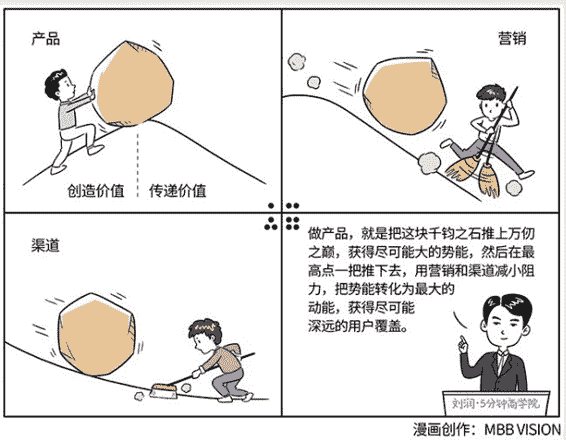 想象一下,一个人正在推巨石上山。做产品,就是把这块千钧之石推上万仞之巅,获得尽可能大的势能,然后在最高点一把推下去,用营销和渠道减小阻力,把势能转化为最大的动能,获得尽可能深远的用户覆盖。