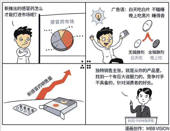 面对同样的市场,在消费者心中与其他感冒药几乎同样的定位,但是因为找到了一个独特的销售主张,白加黑获得了巨大的成功。