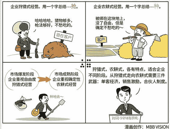 狩猎式、农耕式,各有特点,适合企业不同阶段。从狩猎式走向农耕式,你需要三件武器:单客经济,销售激励,合伙人制度。