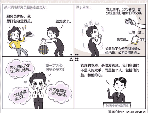 海底捞如何打动员工、激发善意?农村孩子来到城市,公司会给他们培训如何使用ATM机,如何坐地铁。发工资时,公司会把一部分钱直接打给他们的父母,让他们也感受这份荣耀。店长离职,就算去了小肥羊,公司都会给这个员工8万元的嫁妆。如果是小区经理,给20万。大区经理,送一家火锅店,等等等等,据说数不胜数。