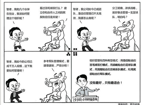 那家企业已经大几百人,无法形成几十人时才有的那种无间的信任。到了可能必须用“交响乐队模式”,或者“军队模式”管理企业的阶段,却怀念“羽毛球双打模式”,只会把公司管得越来越乱。