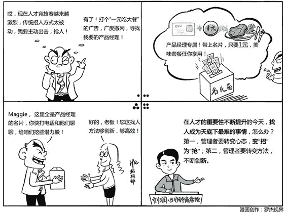 著名的营销人小马宋在暴风影音时,公司急缺产品经理,所以请他设计一个招聘广告。他想,这么久都没找到合适的产品经理,再做一个广告,就能找到吗?于是,他和西少爷肉夹馍联合,在所有连锁餐厅推出产品经理套餐,拿产品经理的名片,就可以1元吃个产品经理套餐。结果收集了大量产品经理的名片,然后让HR去打电话了。