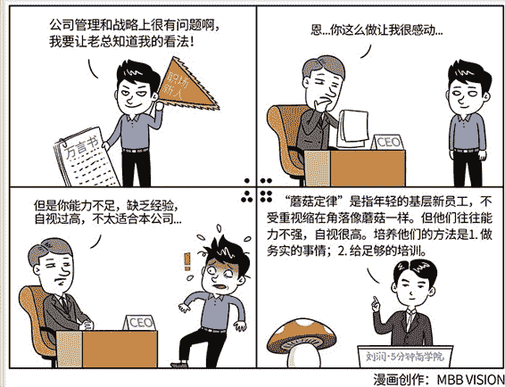 后来,蘑菇定律就特指,年轻的基层新员工,常被置于没人注意的角落,不受重视,甚至打杂、跑腿、受到苛责,就像蘑菇一样:在阴暗处静静生长,没人关注,甚至有时还要被浇上大粪。