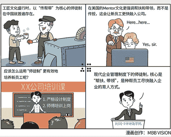 可是在美国,Mentor文化,也就是师徒制,依然非常盛行。只是在企业培训制度越来越完善的前提下,现代的师徒制,更强调帮扶和带领,而不是传授了,它让新员工更快、更好地融入公司,同时让“师傅”,能获得更多的职业成就感,并锻炼领导力。