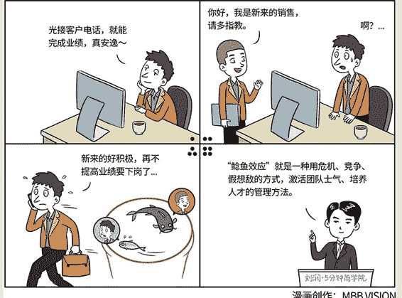 第一,招些新的销售,作为鲶鱼,扔到销售部。这样,平均每个销售接到的客户电话数,就不足以完成业绩了。鲶鱼带来了竞争,大家必须去寻找新客户,或者提高服务水平,增加转化率。