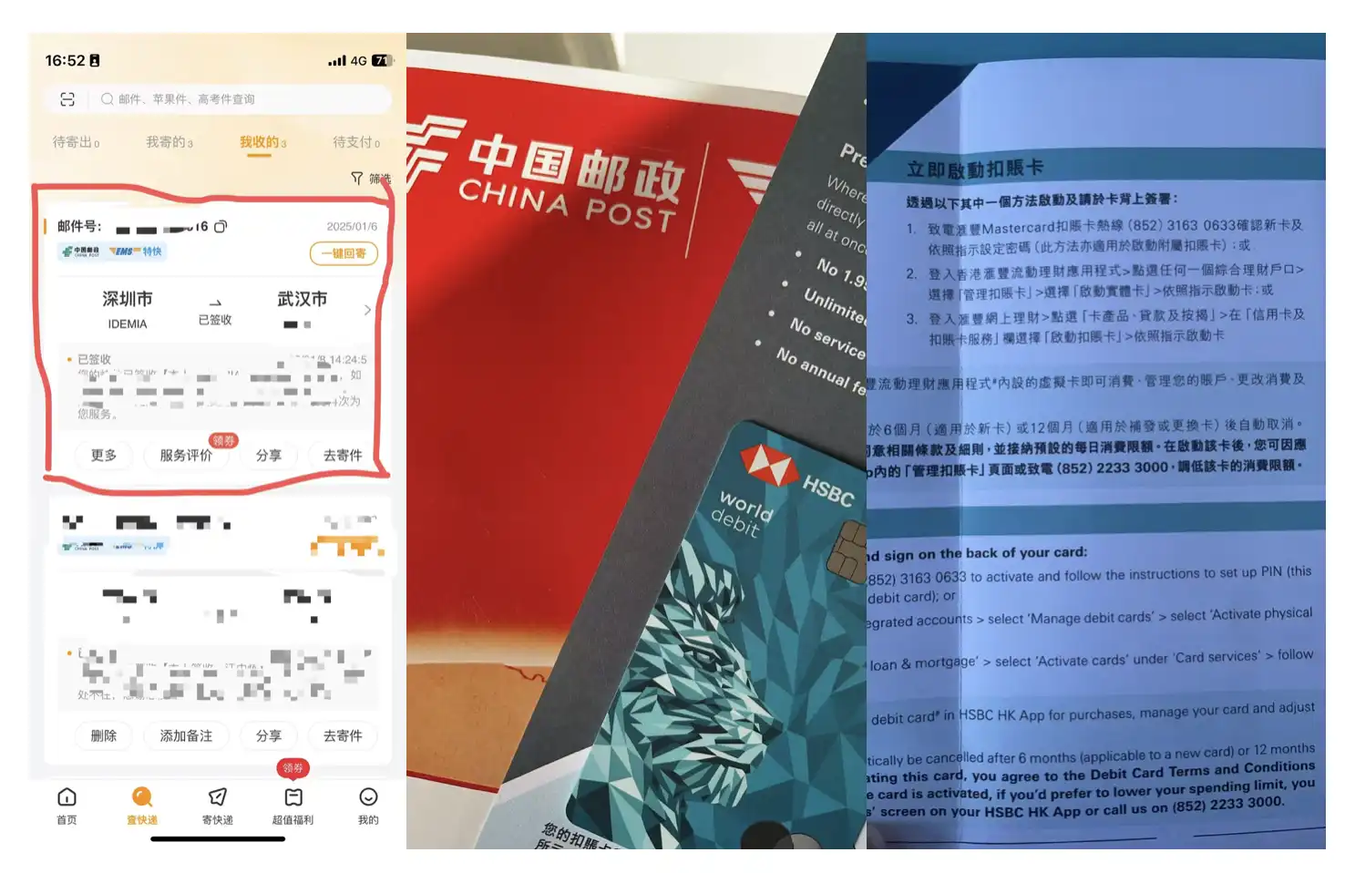 收到卡后,我这个事EMS寄送的,所以在EMS app 上,收邮件的地方
