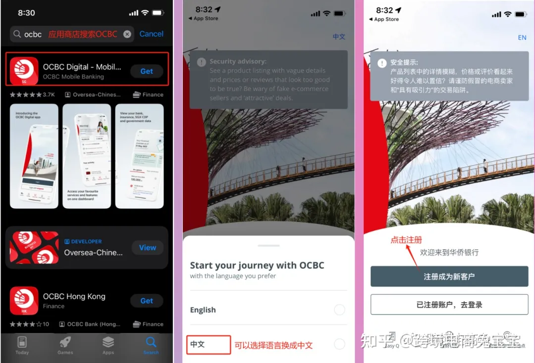 应用商店搜索OCBC,下载App:OCBC Digital - Mobile,打开后把语言换成中文,点击注册成为新用户。
