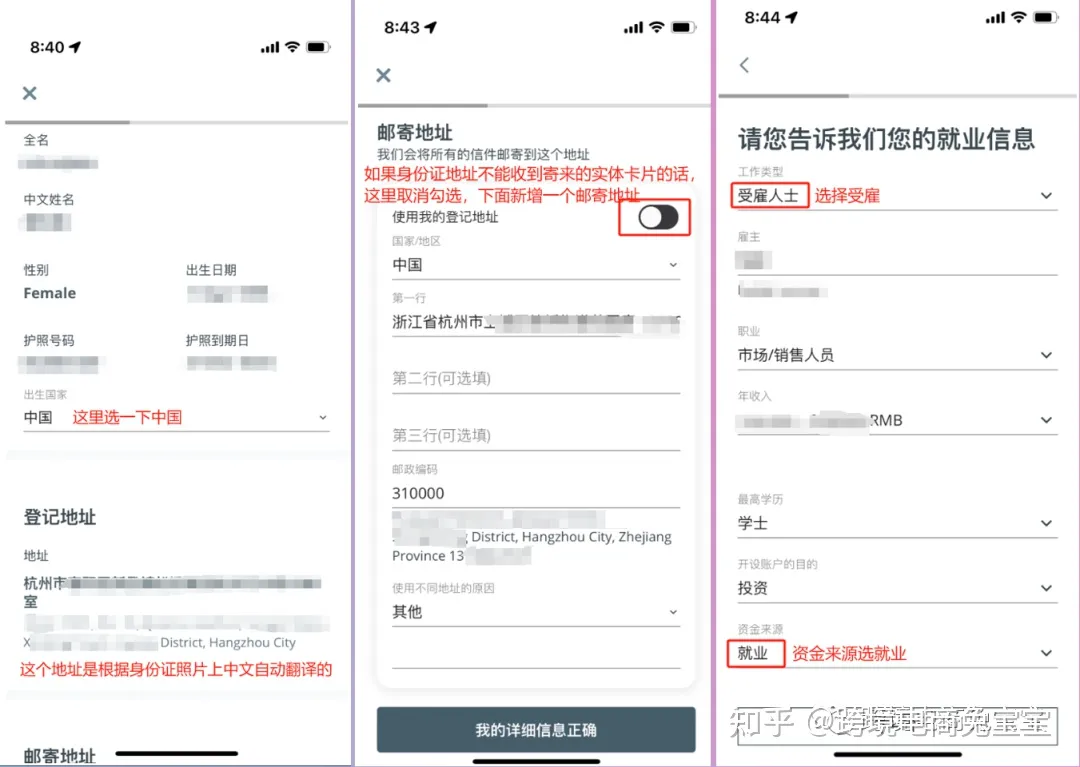 - 然后填写下受雇信息,工作类型选受雇人士,填写雇主,职业,年收入,学历,开户目的,资金来源选就业。