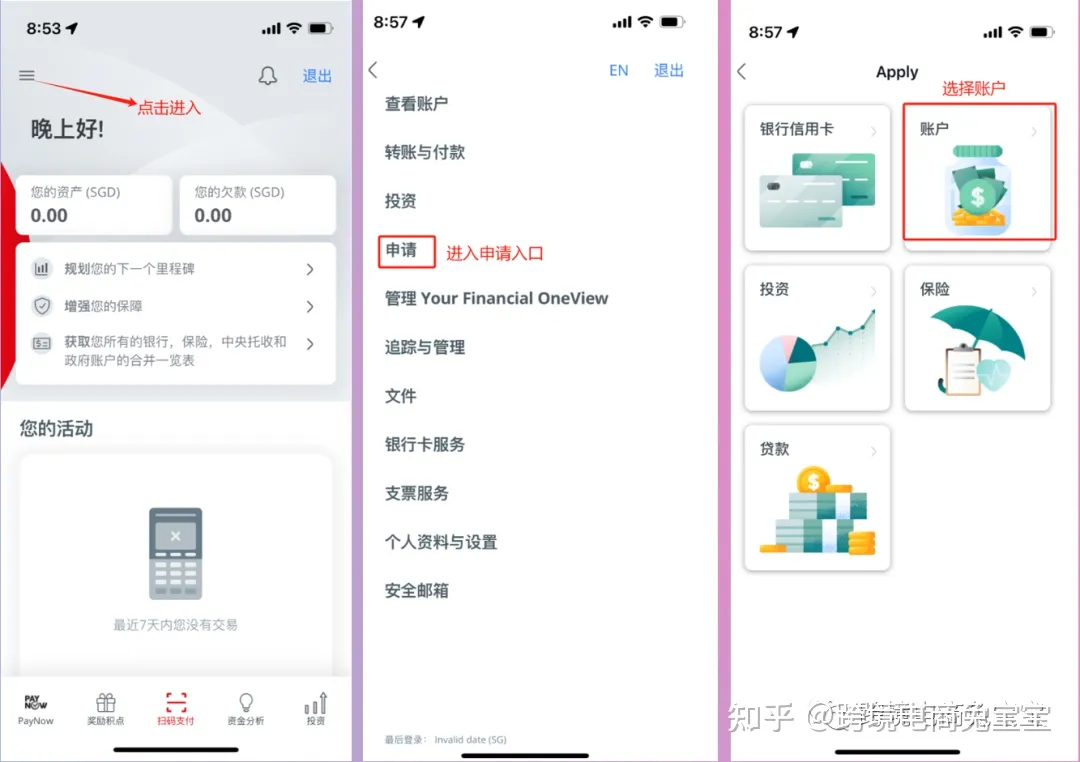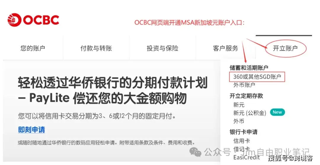依次点击:导航栏——>开立账户——>360或其他SGD账户。