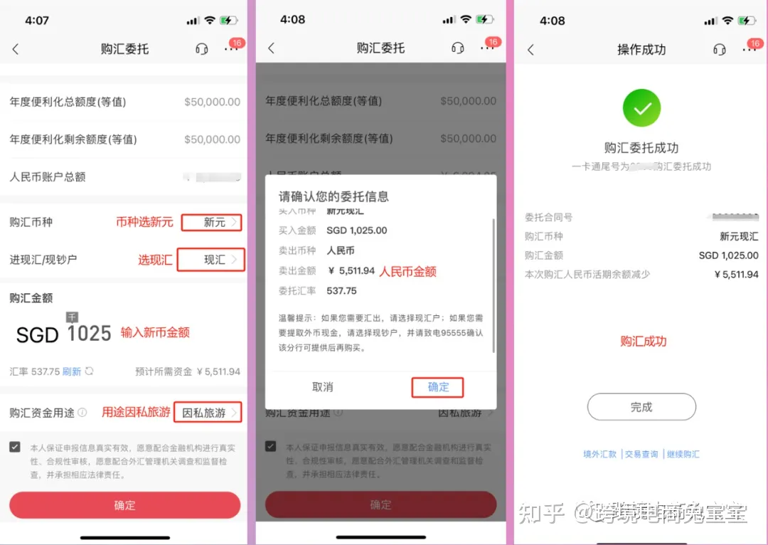 币种选新元,进现汇/现钞户选现汇(现钞是指去柜台拿现钞),输入新元金额(入金1000元,但是会有中转行费用,我是收了20新元,建议至少买1020新元外汇),用途选因私旅游,点击确定会看到人民币金额,确定后就购汇成功了,这样我们账户里就有新元了,才可以去汇新元给华侨银行。