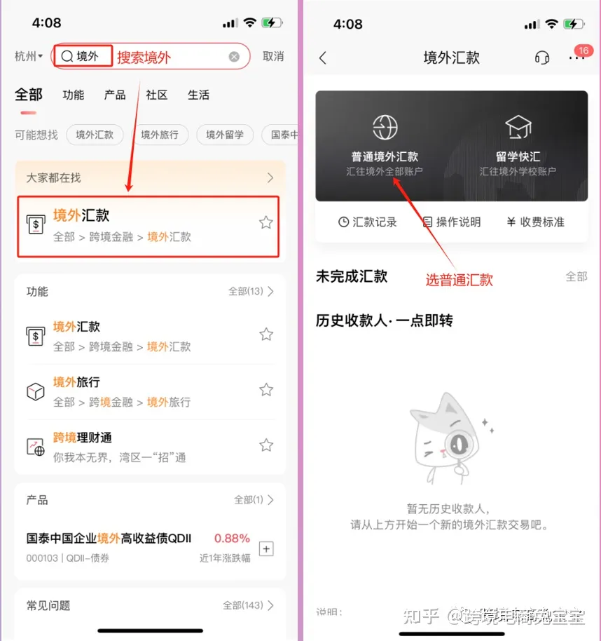 搜索境外,选择境外汇款,选普通境外汇款。